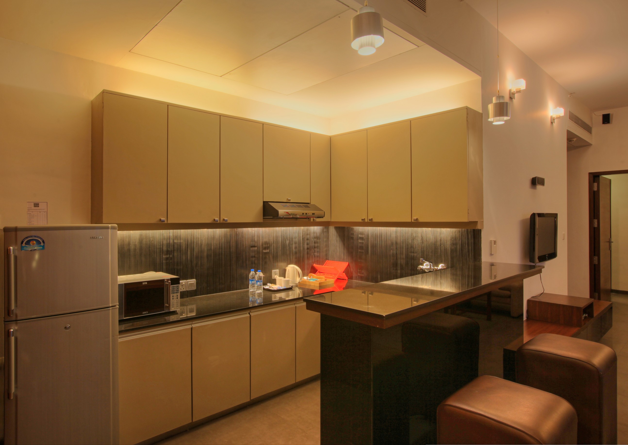 Montecarlo is a large 2 Bedroom, hall, fully furnished, full serviced apartment measuring 1200 Sq.Ft. The highlight of the apartment is a patio with a dining area and a romantic water feature around which guests can lounge and entertain friends in the evenings. The living room has an attached bar and kitchenette, an outdoor dining area and a powder room. It includes a home theatre, plush sofa seating. The highlight of the apartment is the walk in dresser and wardrobe which forms a part of the bathroom.