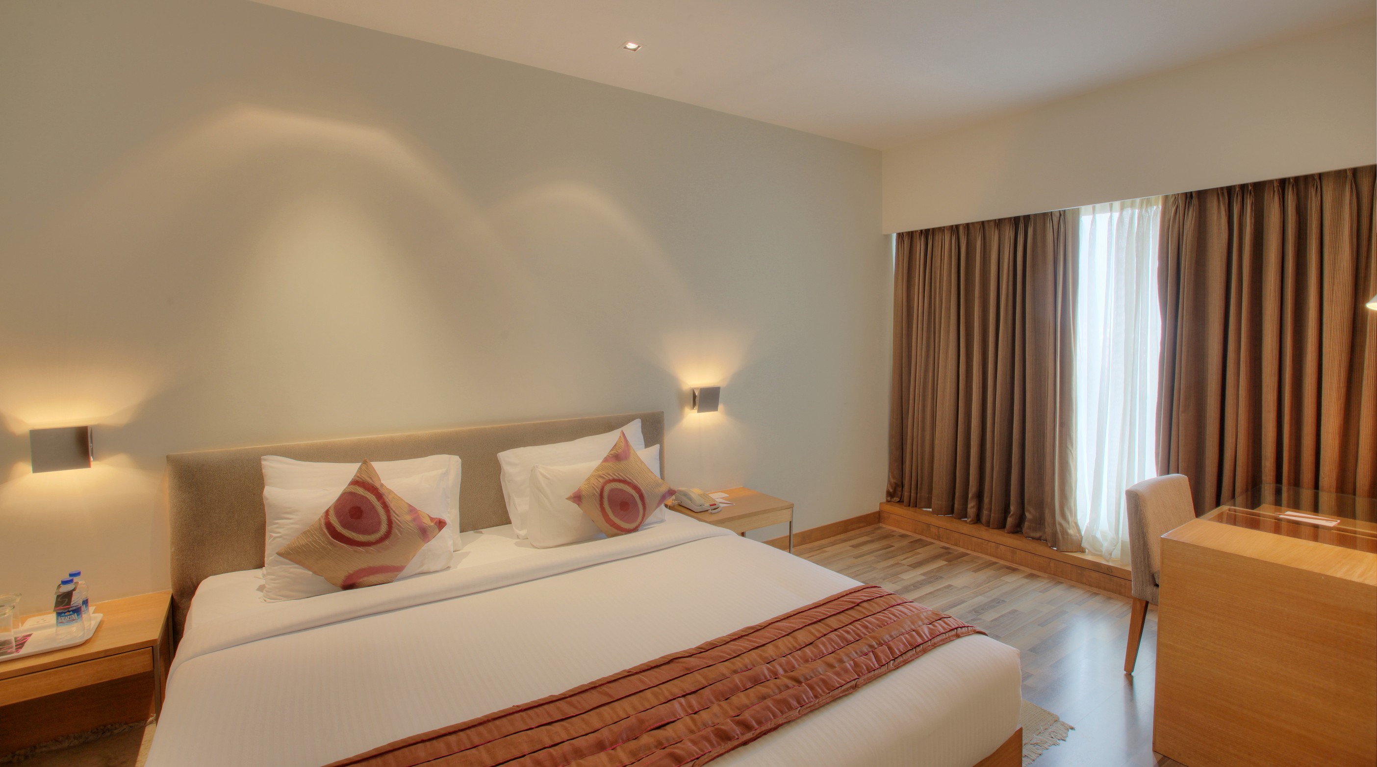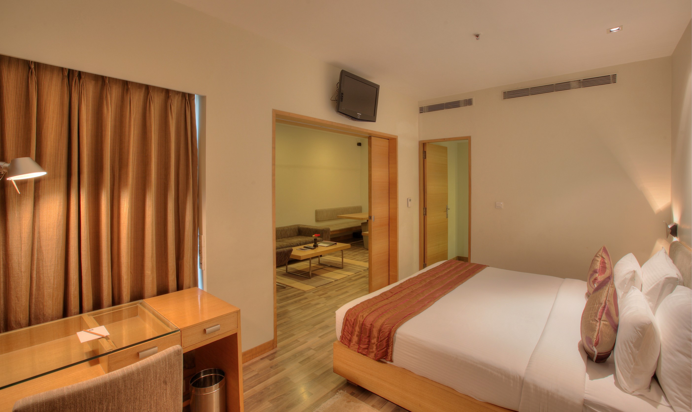 With walnut interiors and Indian hand-tufted carpets – space, space and more space. A choice of king or twin beds, this room blends contemporary aesthetics with old world charm. A large work desk, bedside controls, ambient lighting, mood settings and airplane soft reading lights … creature comforts at their best.
