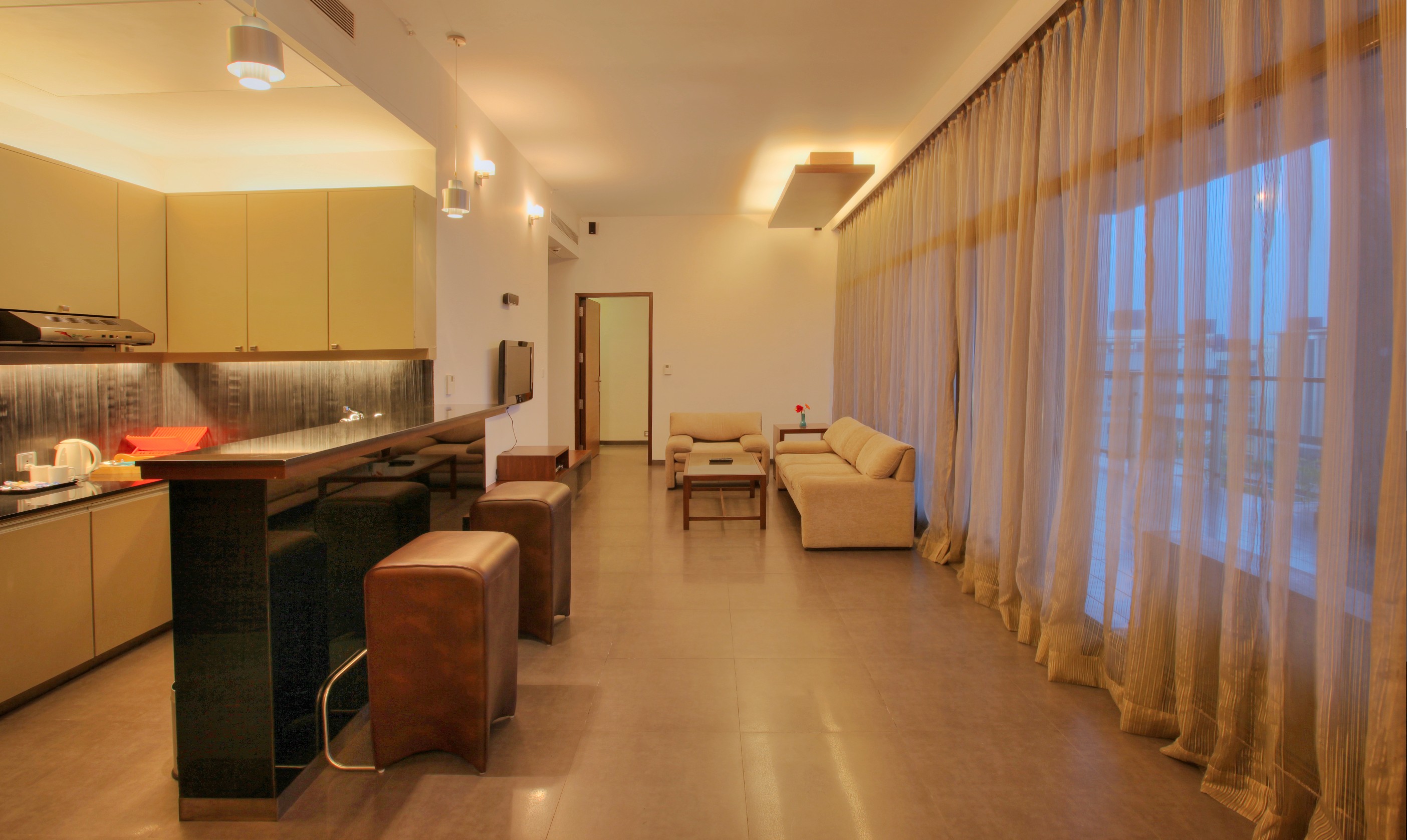 Montecarlo is a large 2 Bedroom, hall, fully furnished, full serviced apartment measuring 1200 Sq.Ft. The highlight of the apartment is a patio with a dining area and a romantic water feature around which guests can lounge and entertain friends in the evenings. The living room has an attached bar and kitchenette, an outdoor dining area and a powder room. It includes a home theatre, plush sofa seating. The highlight of the apartment is the walk in dresser and wardrobe which forms a part of the bathroom.